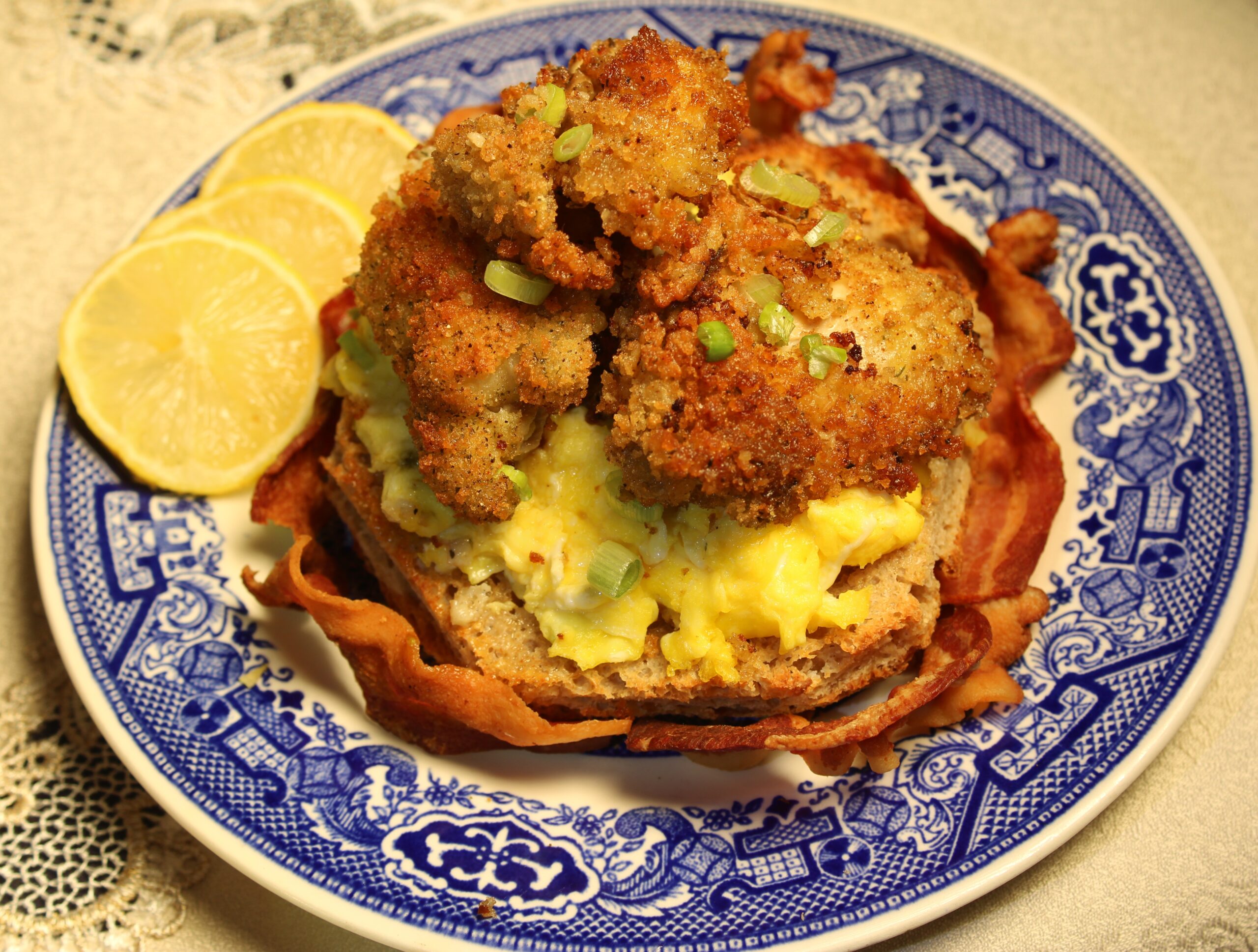 Place the fried oysters on top of the scrambled eggs.